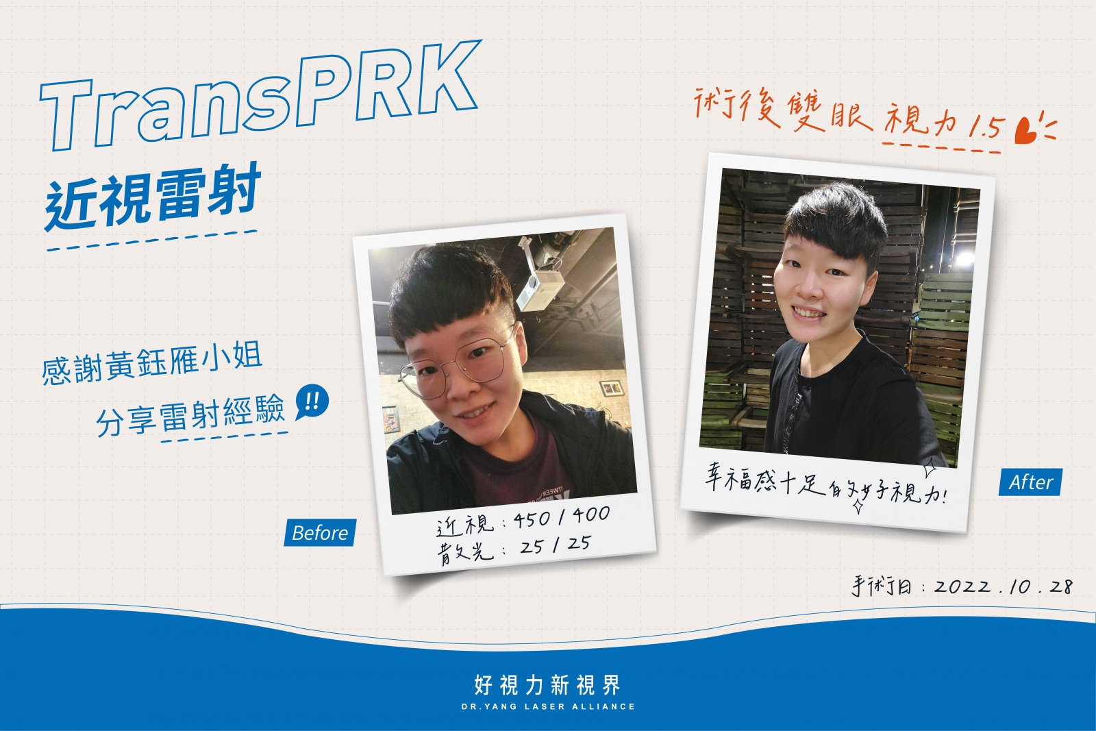 現在已經術後一個月,一開始手術完回家麻藥退真的眼睛不舒服也睜不開眼,還瘋狂流眼淚,但好好睡覺過了一天,眼睛也能睜開了,只是看東西都霧濛濛也很畏光,差不多到第三天眼睛開始乾澀,我很認真的點人工淚液保持眼睛濕潤,在這期間眼睛一直有異物感不是很舒服,差不多到第六天覺得眼睛沒那麼卡卡的感覺,隔天也到了我回診的日子,測量視力至少都有1.0,這真的是難以形容的感覺,我竟然看的到欸!然後醫師也幫我取下術後的隱形眼鏡,也說近一個月角膜還在生長要好好照顧,度數才會越來越好喔~