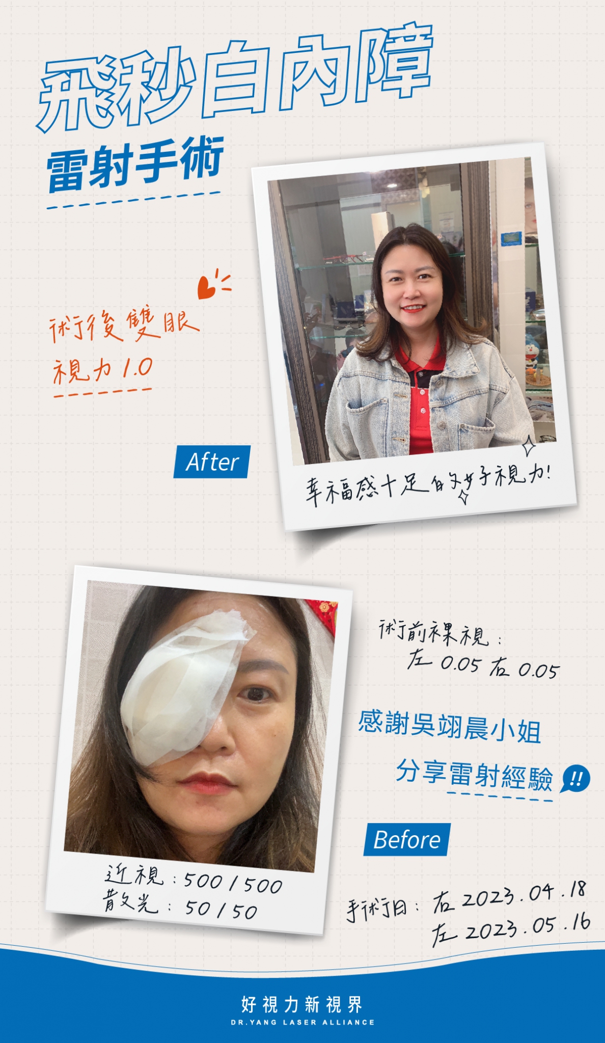 在手術前也因為專員美慧姐的專業叮嚀,大大舒緩了我緊張的情緒,可以很好的配合楊志盛院長,讓手術成功完成!目前術後已經兩個月了,雙眼視力1.0,不管看遠、中、近都很清晰,甚至可以在夜間安全開車,恢復良好!