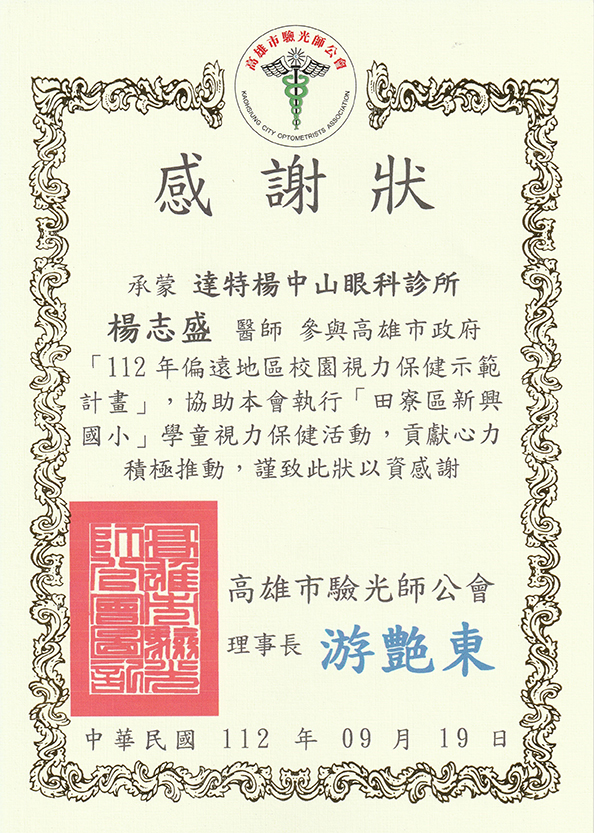 達特楊眼科聯盟總院長楊志盛醫師參與【高雄市政府112年偏遠地區校園視力保健示範計畫】,榮獲感謝狀致謝