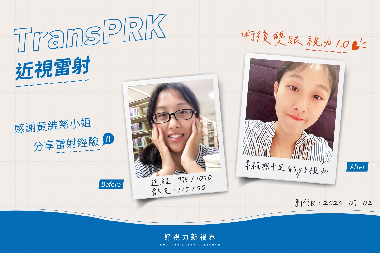 現在我選擇的手術方式,雖然前期很不舒服,恢復得比較慢,但現在也越來越好了,目前術後一個月 眼睛已經1.2 1.0了!醫師說未來視力還會更好,這是以前一千多度的我完全無法想像的~