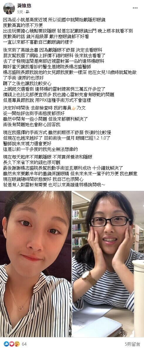 現在每天起床不用戴隱眼,不用買保養液和隱眼,長久下來省下來的錢也很可觀!最後謝謝楊志盛院長幫我動手術並且順利成功,十分鐘就解決了,雖然未來要戴半年的墨鏡保護眼睛,但未來未來一輩子的方便,我也願意!!!現在眼睛隨時間狀態變好,我自己也很開心,若是有人對雷射有需要,也可以來高雄達特楊詢問哦~